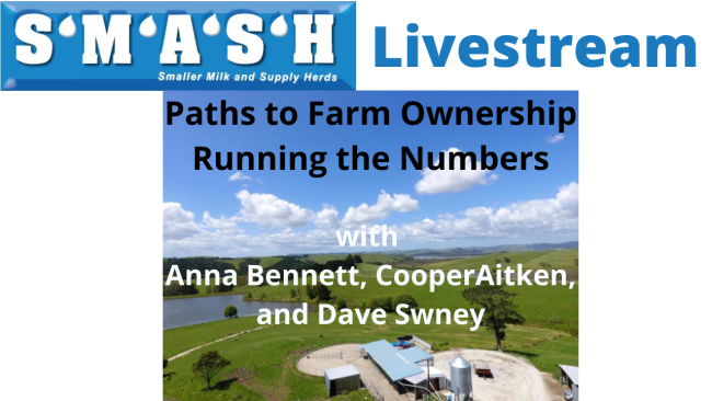 Anna Bennett (accountant) has many clients who she has helped to successfully navigate the path to farm ownership. If farm ownership is your dream watch her and Dave Swney (farmer and SMASH committee member) to learn practical strategies to help you to achieve your goal. This session is also for people at the other end of their career who want to investigate effective strategies for exiting their farm business.